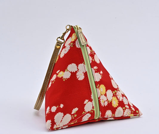 Découvrez les Sankaku Pouches (さんかくぽーち), pochettes en forme de triangle fabriquées à partir d'ojuban 100% soie, les kimonos intérieurs rouges portés exclusivement par les geisha et les maiko. Disponibles dans une variété de nuances de rouge et d'imprimés ludiques, ces pochettes sont uniques en leur genre. Dispose d'une poche intégrée avec un bracelet en cuir véritable.