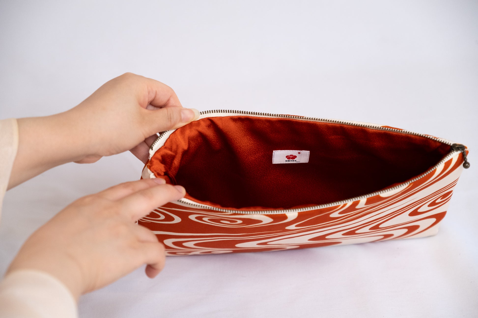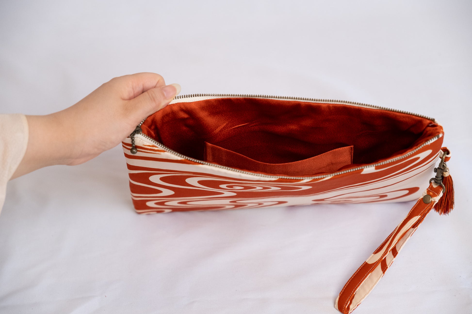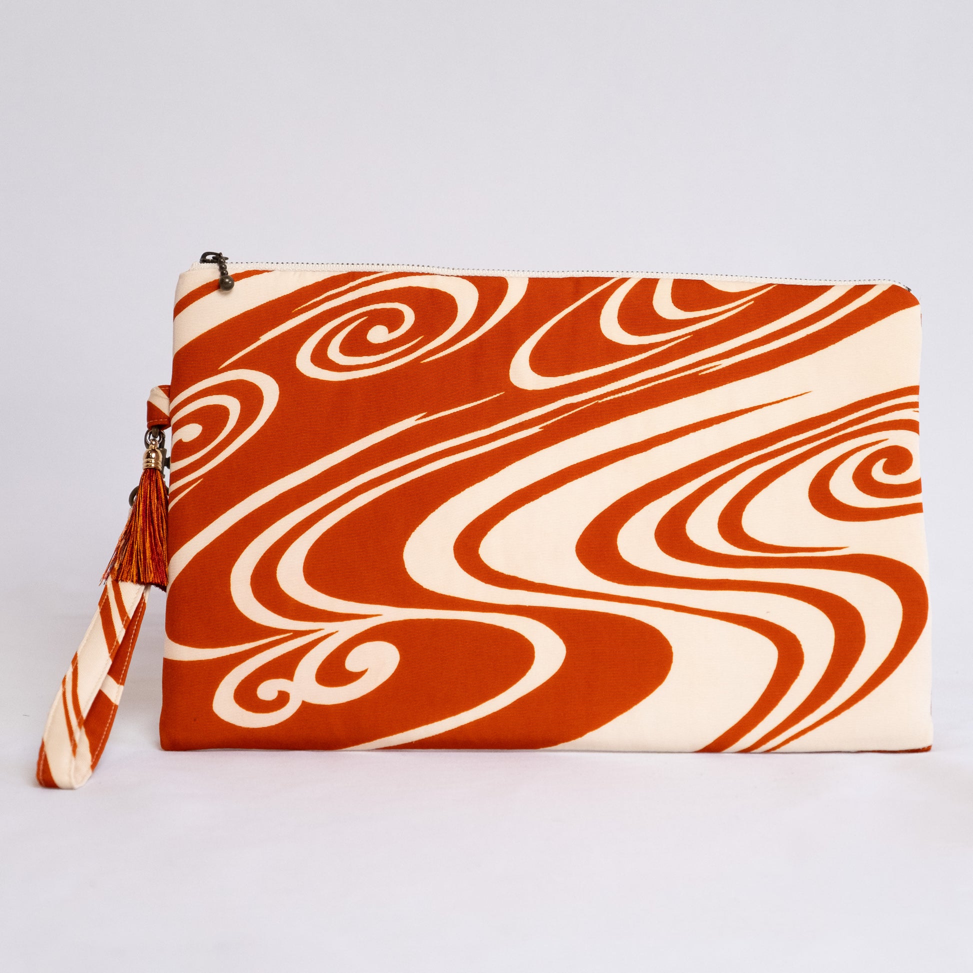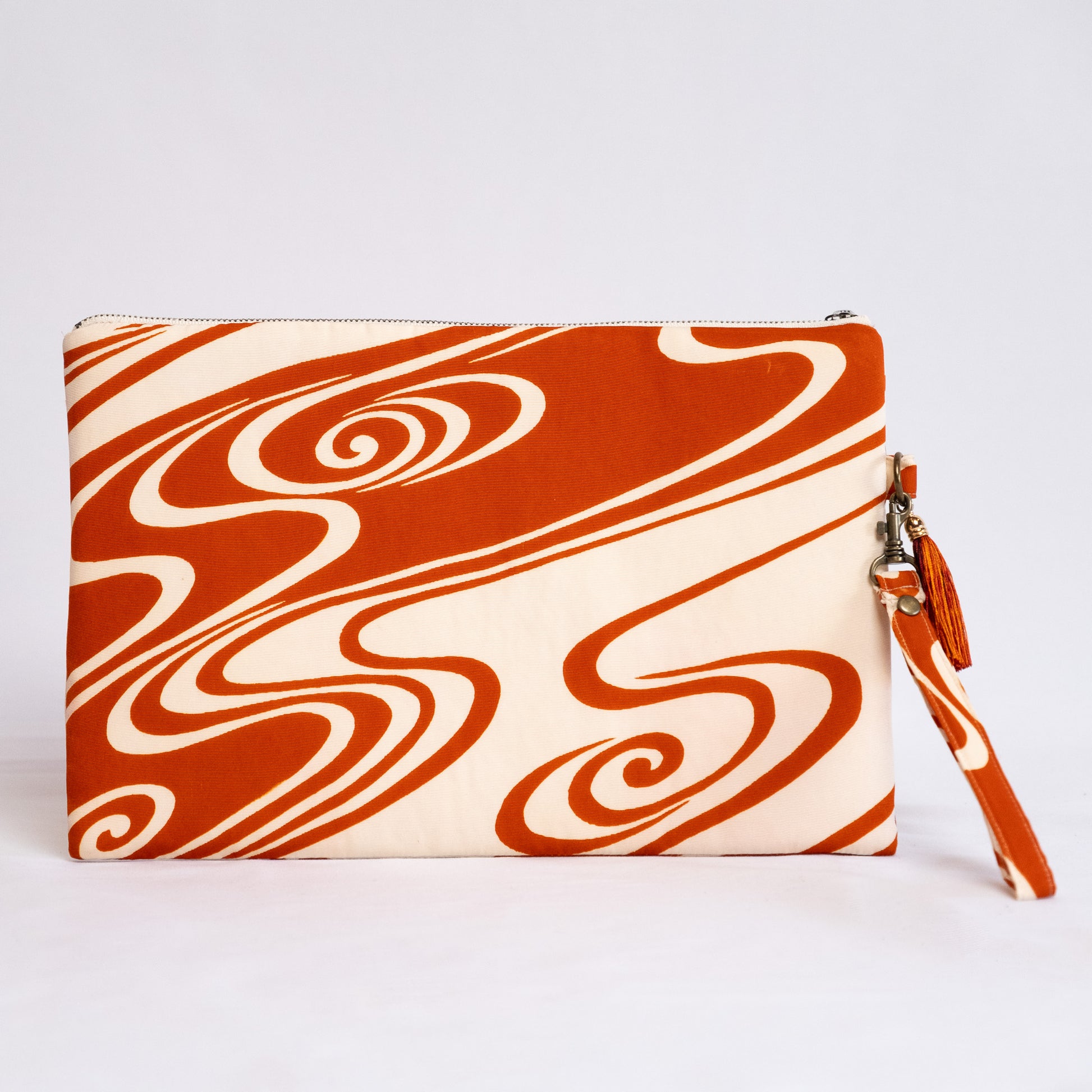 Élégante pochette plate réalisée à partir d'un Darari Obi vermillon et crème recyclé, avec un motif « Flowing Water ». Au Japon, le motif propice de l'eau qui coule symbolise la pureté, car l'eau qui coule est toujours pure et exempte de boue. Cela représente également les difficultés et le malheur emportés.