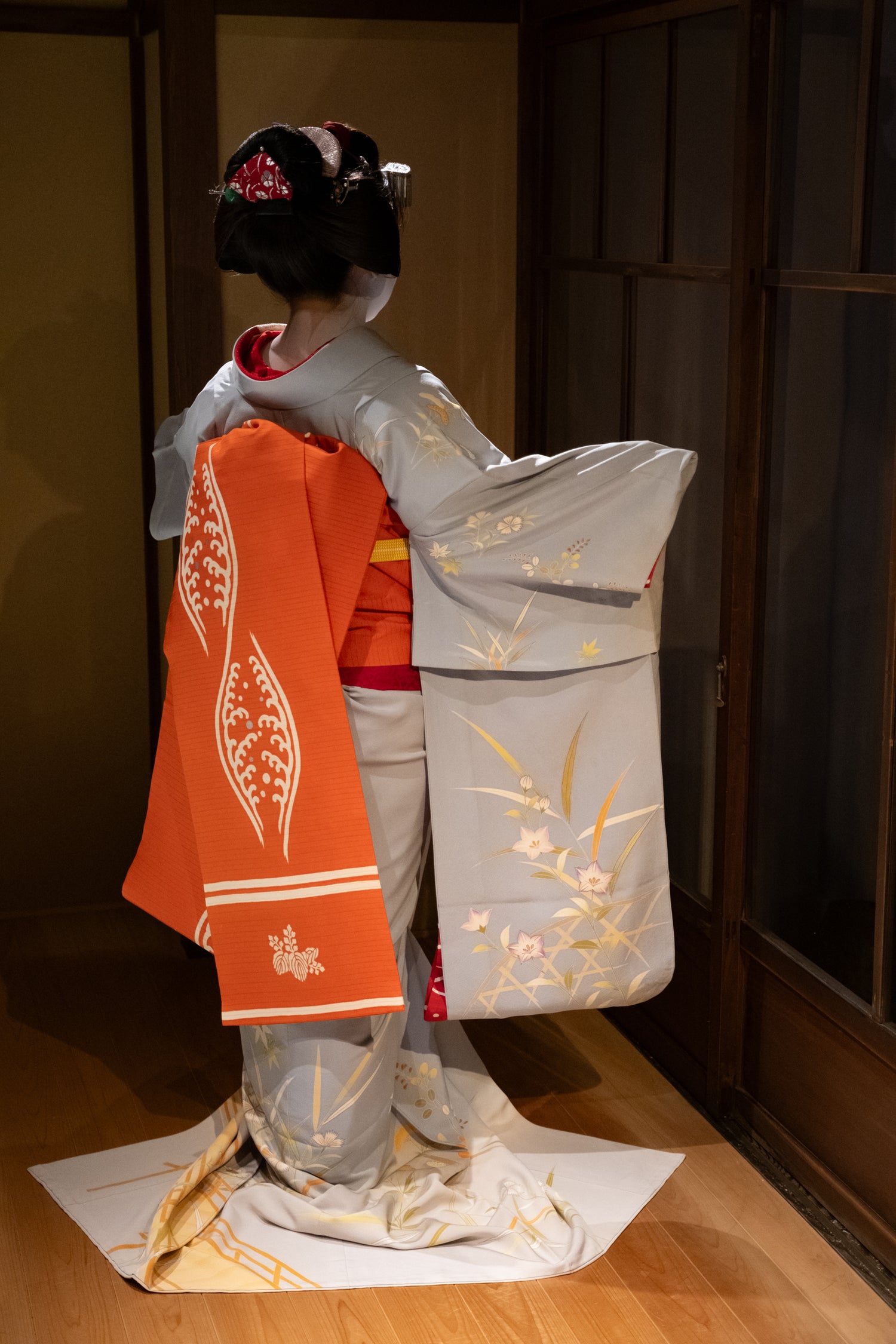 The "Darari Obi" is a type of obi (traditional Japanese sash paired with a kimono) typically worn by Maiko (young geisha apprentices) during their training period. The obi is considered a symbol of the Maiko's status and skill level, as tying the Darari Obi requires a high level of proficiency and practice.