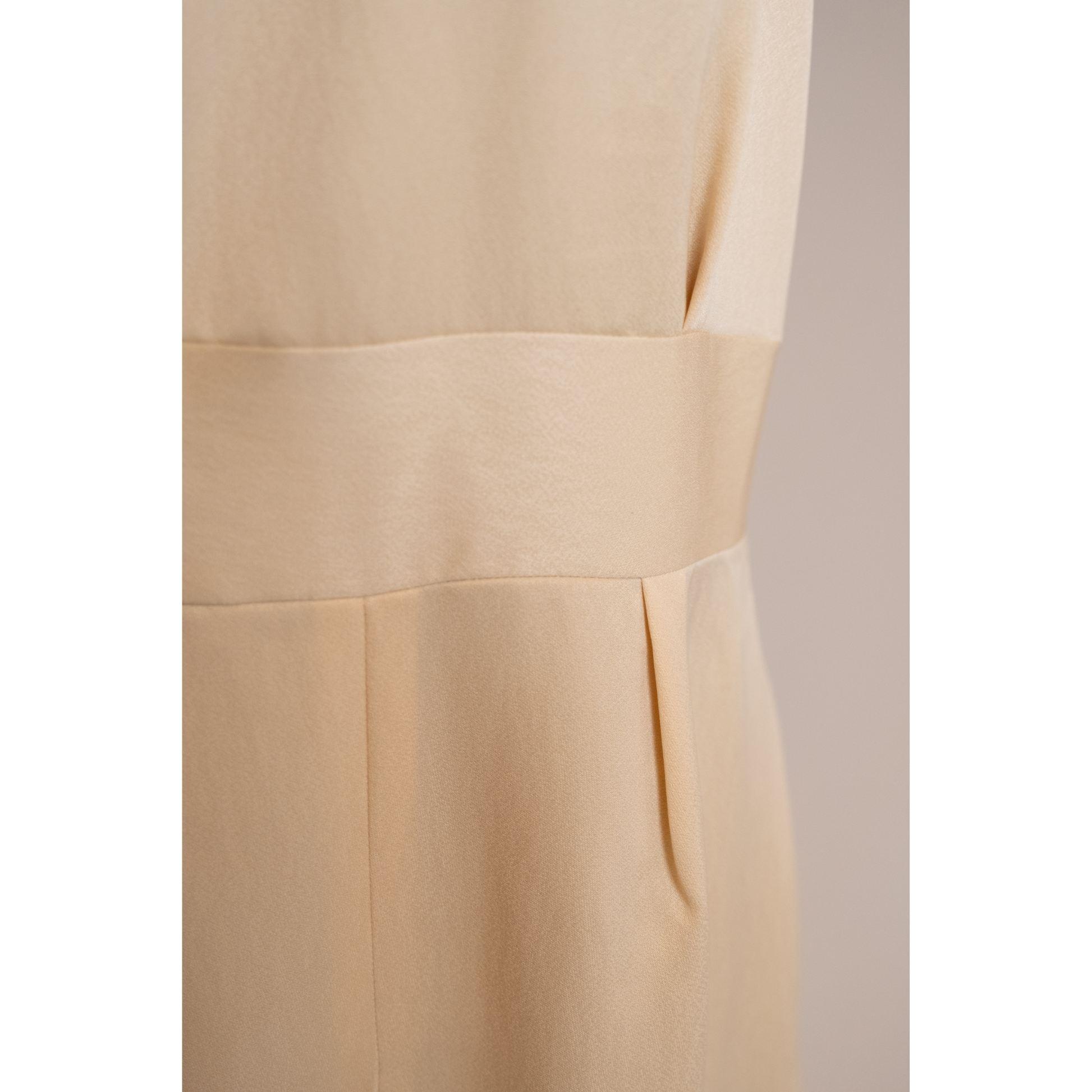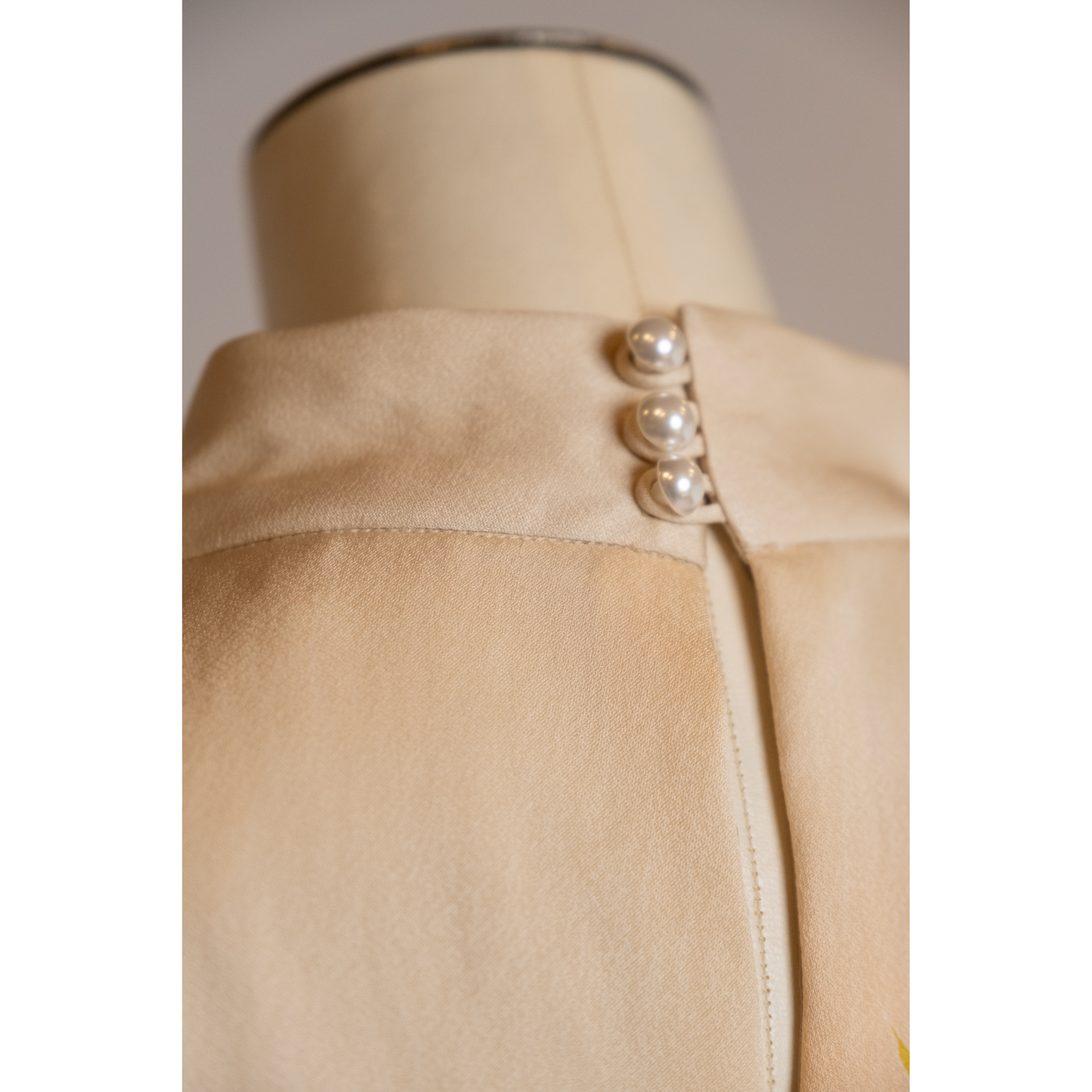 Profitez de l'allure exquise de cette robe dos nu mi-longue en soie, méticuleusement confectionnée à partir d'un authentique kimono recyclé qui ornait auparavant la précieuse Geiko d'Umeno. Une délicate fermeture à boutons en perles orne le décolleté, accentuant le design gracieux du dos nu, tandis qu'une séduisante fente au dos ajoute une touche d'intrigue. La robe est soigneusement finie avec une fermeture éclair latérale discrète pour un port sans effort.